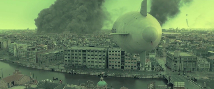 “四行仓库保卫战”被看作一场直播战争,不同的人在岸边、船上、屋里的窗户、楼顶等不同角度去观看这场战争。蒋介石之所以让“八百壮士”守卫四行仓库,很大程度上是将此作为在九国公约上的谈判砝码,所以当时很多外国观察家和媒体对这场战事也十分关注。为了让观看视角更为立体化,林木就想到了一个更高的视角——飞艇,在乌云密布的天空悬挂着一个飞艇,外国观察家和记者从高空去看这场战斗,也赋予了影片一定的超现实感。