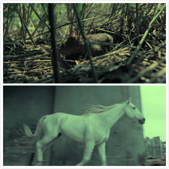 影片开场第一个镜头,就是一只老鼠听到枪炮声惊恐逃窜回洞,而片中也频繁出现老鼠四处乱跑的特写。与这个偷生隐喻形象相对照的是贯穿全片的神俊白马,它时而在臆想中与孤胆英雄赵子龙独挡群敌,时而在现实中与不屈的谢晋元单骑赴会,在敌人炮火淫威下,白马纵使浑身染血仍在残破的战场上昂头奔驰。就在很多观众以为白马已经殒命在日军的轰炸时,影片最后,白马从四行仓库废墟中一跃而出,与开篇老鼠形成强烈反差,寓意生生不息。