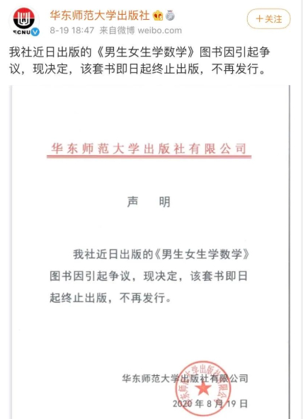 在“数学教材分男女”引发广泛争议后,8月19日晚,华东师范大学出版社发布声明,之前推出的《男生女生学数学》系列教辅材料,即日起终止出版,不再发行。