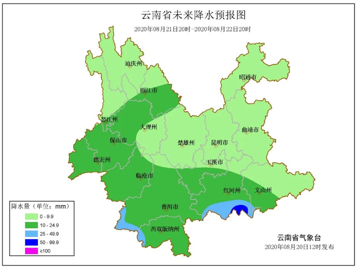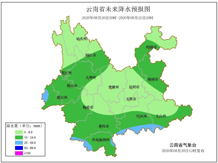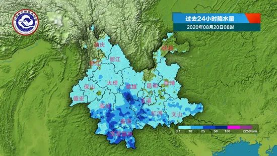 暴雨接着下,8月19日8时至8月20日8时,楚雄南部、玉溪东部、临沧西部、普洱、西双版纳、红河南部出现中到大雨局部暴雨,其他地区出现小雨局部中雨。