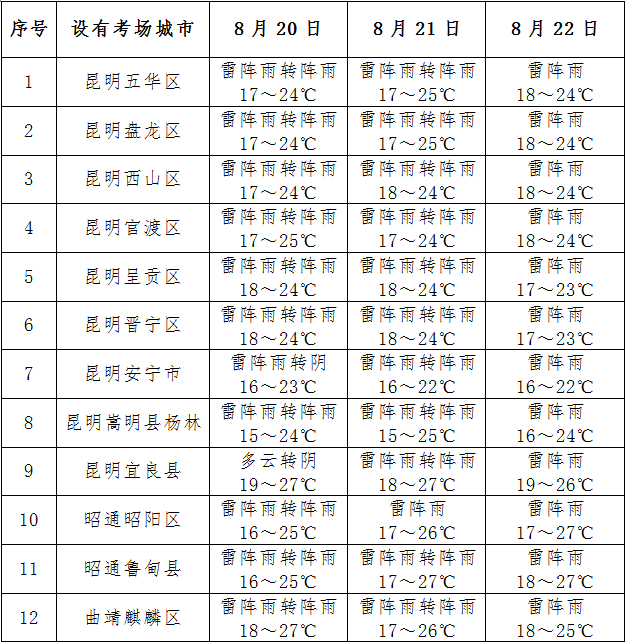 云南2020年公务员考试天气预报