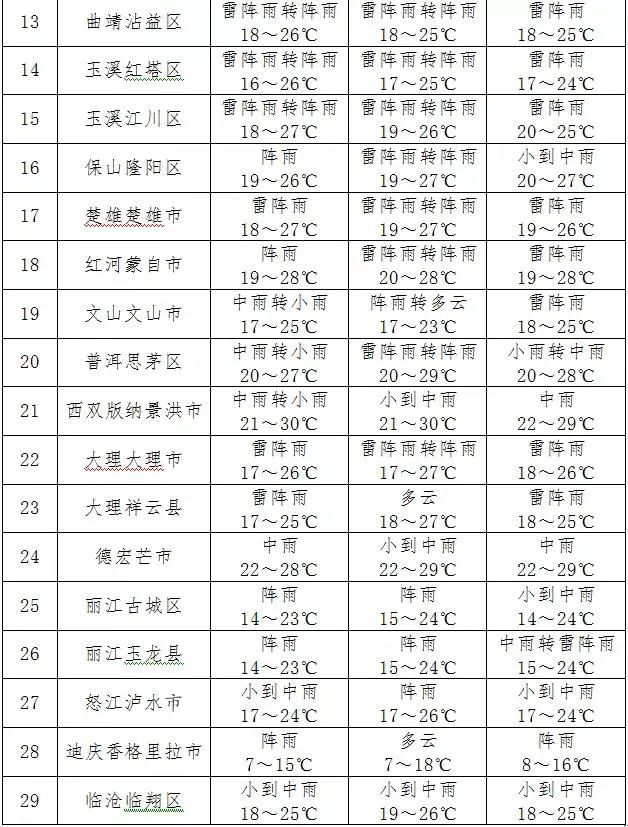 昭通南部、曲靖、文山南部、红河南部、普洱南部、西双版纳、临沧西部、德宏、保山、大理、丽江、怒江南部多云间阴有小到中雨局部大雨,其他地区多云有阵雨局部中雨。