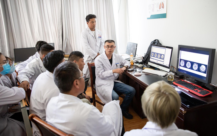 玉树州人民医院,第四批第一期北京援青医疗专家苏建伟(中坐)给影像中心医务人员做培训。