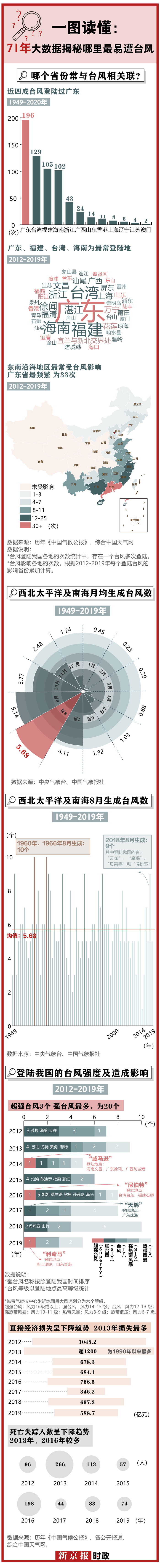 中国天气网大数据显示,1949-2019年,共有491个台风登陆我国,其中有189个登陆过广东。今年已经生成的7个台风中,有4个台风在我国登陆,其中2个登陆广东。据推算,1949年以来,登陆我国的台风中,有38.6%登陆过广东,广东因此为全国台风登陆最多的省份。由于部分台风存在多次登陆的情况,191个台风共计登陆广东196次,也为全国之首。