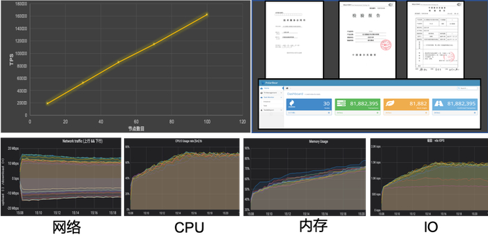 测试结果显示北大数瑞分布式账本系统在公网环境、100节点规模下的存证性能可超过16万TPS;而且与传统链式分布式账本随着节点数目增加整个网络的吞吐率下降不同,北大数瑞分布式账本随着节点数目的增加,节点并行共识,整个网络的吞吐率呈现线性增加趋势。