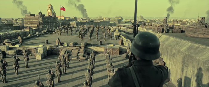 夜晚:2、一批日军死士从半地下水道潜入仓库,被歼灭;另一批日军从南墙架梯子进入仓库偷袭,南岸租界打开照明灯提醒国军,两军在仓库里展开激战;南岸的三个学生渡河进入四行仓库,想要加入军队。