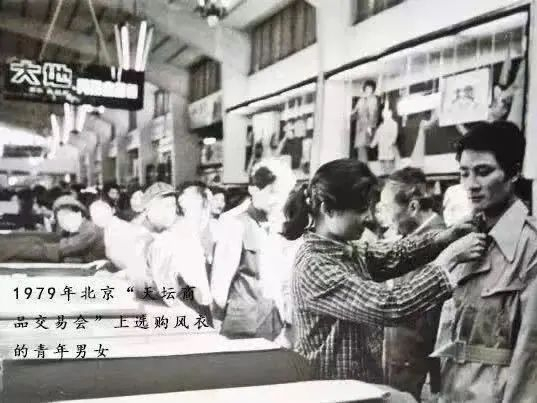1979年北京“天坛商品交易会“上选购风衣的青年男女