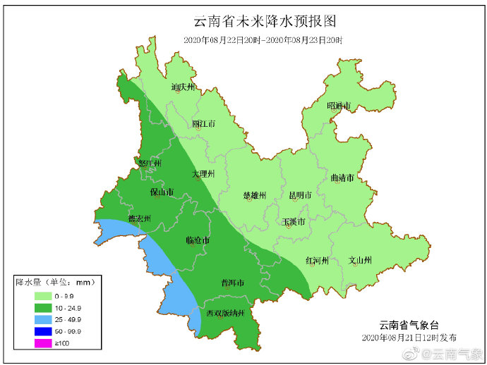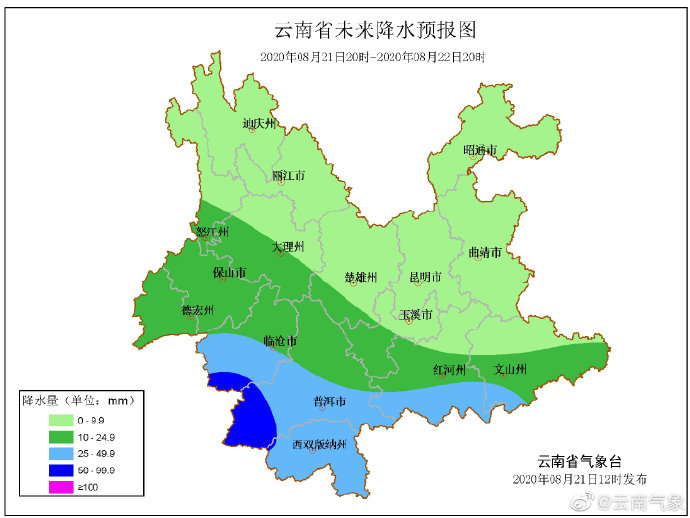 8月21日15时30分,云南省自然资源厅、云南省气象局联合发布地质灾害气象风险预警,预计8月21日20时至8月22日20时, 昭通、怒江、迪庆、丽江、大理、德宏、保山、普洱、红河部分地区发生滑坡泥石流等地质灾害的风险高; 昭通、曲靖、怒江、迪庆、丽江、大理、德宏、保山、普洱、西双版纳、红河、文山、楚雄、玉溪及昆明部分地区发生滑坡泥石流等地质灾害的风险较高。