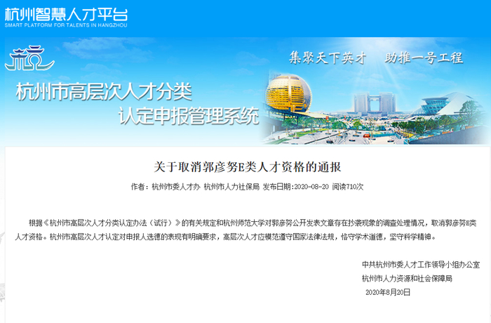 新京报快讯 据杭州智慧人才平台网站消息,8月20日,杭州市委人才工作领导小组办公室、杭州市人力资源和社会保障局联合发布关于取消郭彦努E类人才资格的通报。