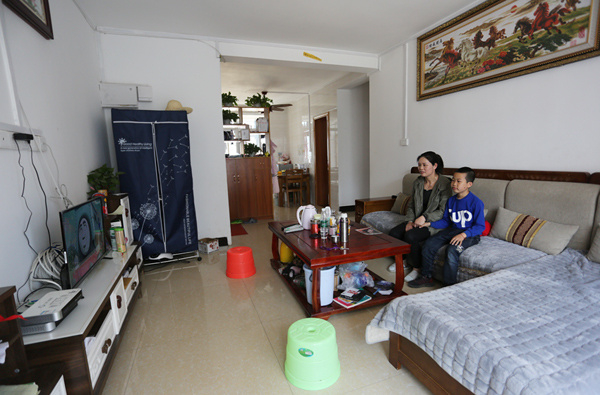 欧阳庚兰与儿子在新房子里看电视。 严立政摄