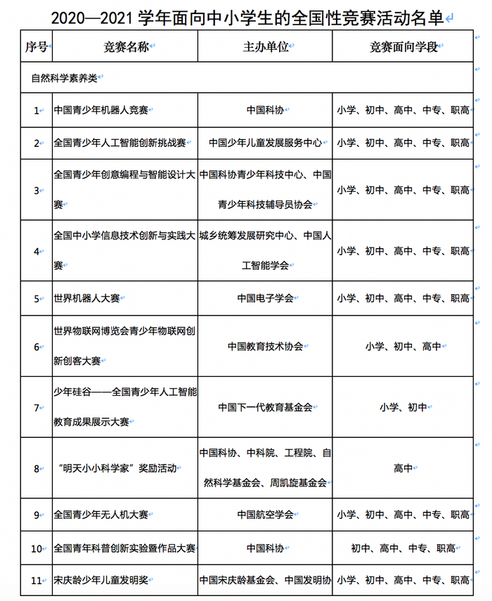 相比,今年入围竞赛数量上有所增加。“世界机器人大赛”、“ 少年硅谷——全国青少年人工智能教育成果展示大赛”“ 宋庆龄少年儿童发明奖”“ 全国青少年禁毒知识竞赛”等均为今年新入围。