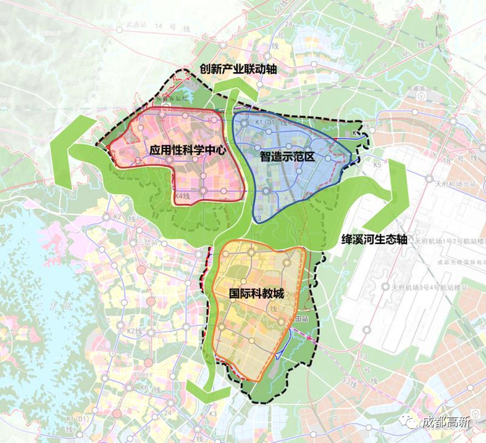 未来科技城是成都建设中国西部(成都)科学城的重要一极,由成都高新区全力打造。根据规划,未来科技城将形成“两轴三片”的空间布局。其中,“两轴”分别为东西向的绛溪河生态轴、南北向的创新产业联动轴;“三片”即国际科教城、智造示范区、应用性科学中心。此次签约落地的电子科技大学、四川大学科创空间位于福田TOD 4.6平方公里起步区内,科创空间建设规模达到100万平方米。