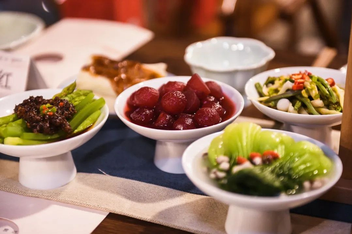 春食姜豉、夏食莲房鱼包、秋食蟹生、冬食盏蒸羊。在江南新城樵坪山脚下,石头、亭廊、瀑布……宋宴席桌摆在一座古朴别致的四水归堂建筑里。