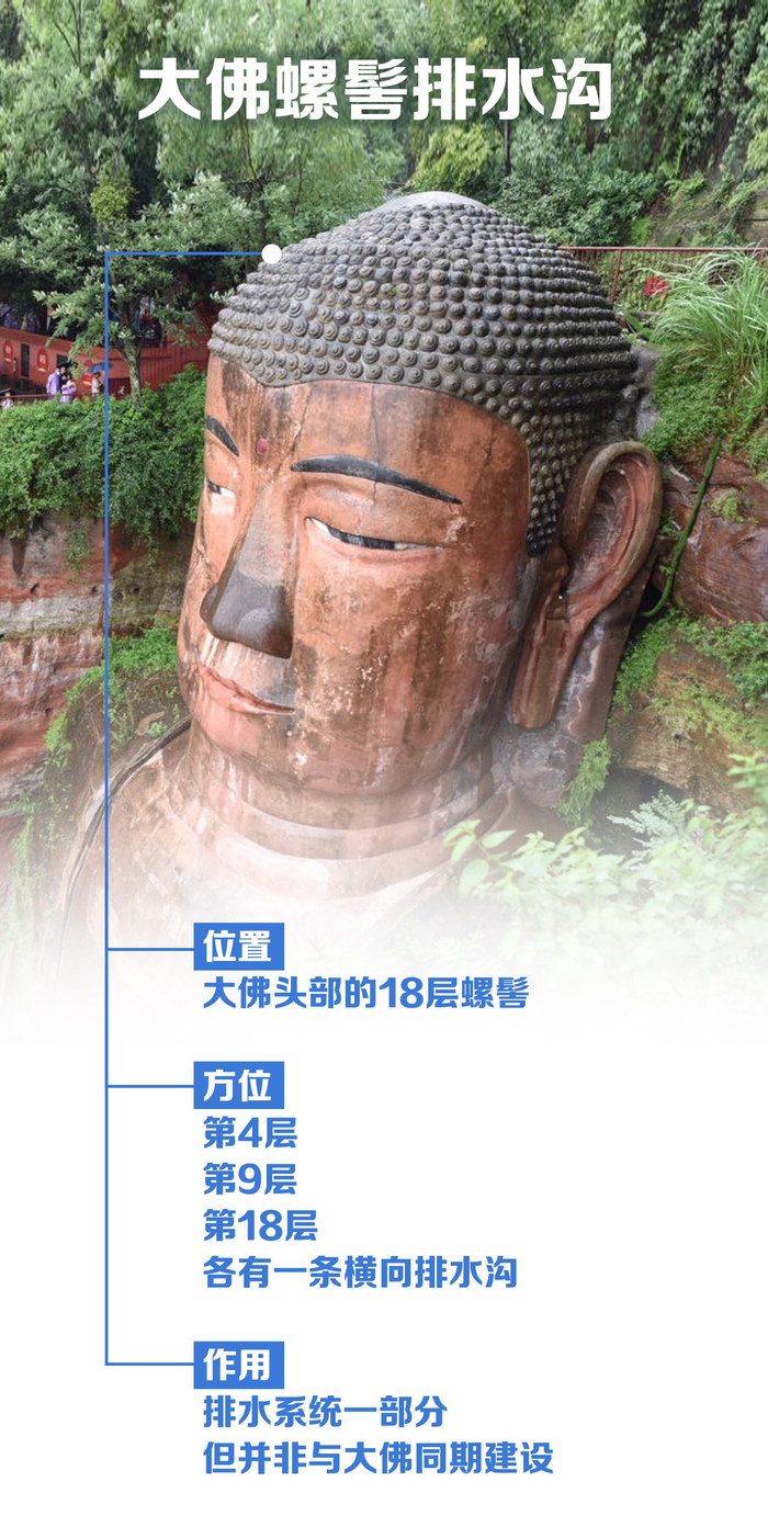 清代诗人王士祯在咏颂乐山大佛时,曾写到“泉从古佛髻中流”,是形容在雨天时,顺着大佛发髻中的沟壑顺流而下的雨水。而在大佛头部的18层螺髻中,也确实在第4层、9层、18层各有一条横向排水沟,分别用锤灰垒砌修饰而成。但彭学艺指出,虽然发髻中的沟壑同为排水系统的一部分,但经考察并非与大佛同期建设。