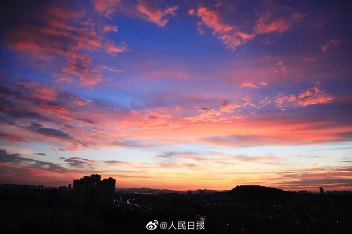 北京天空出现条状七彩晚霞,美得像一幅油画。
