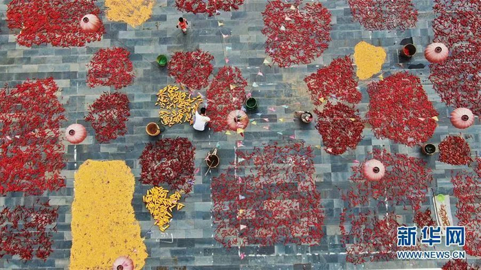 贵州省黔东南苗族侗族自治州锦屏县的村寨中,村民利用晴好天气晾晒红辣椒、玉米等农作物。
