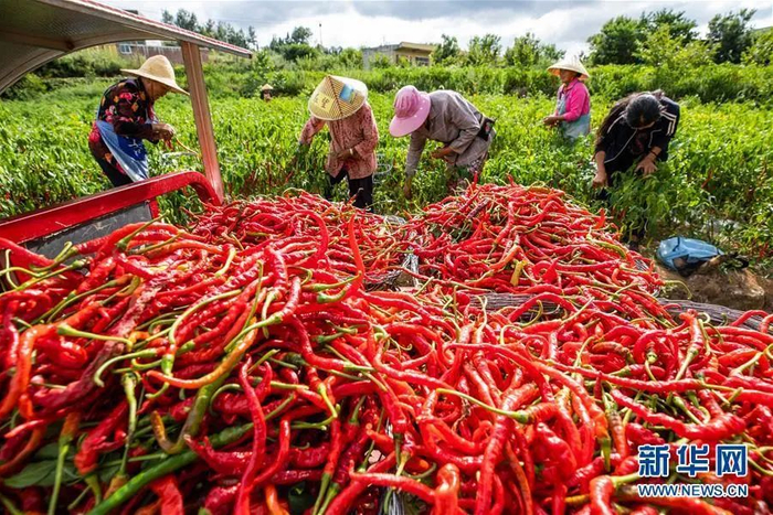 村民在贵州省毕节市金海湖新区常丰社区采收成熟的辣椒。