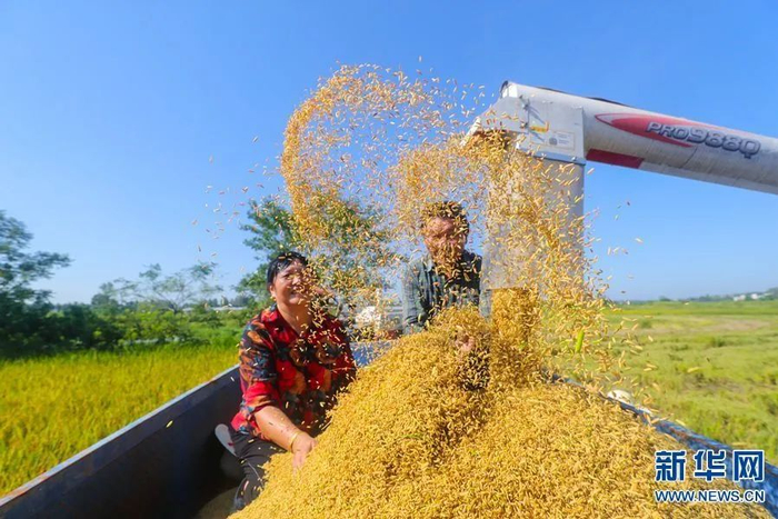 河南省信阳市光山县罗陈乡张楼村,青龙河合作社的社员正在收割再生水稻。