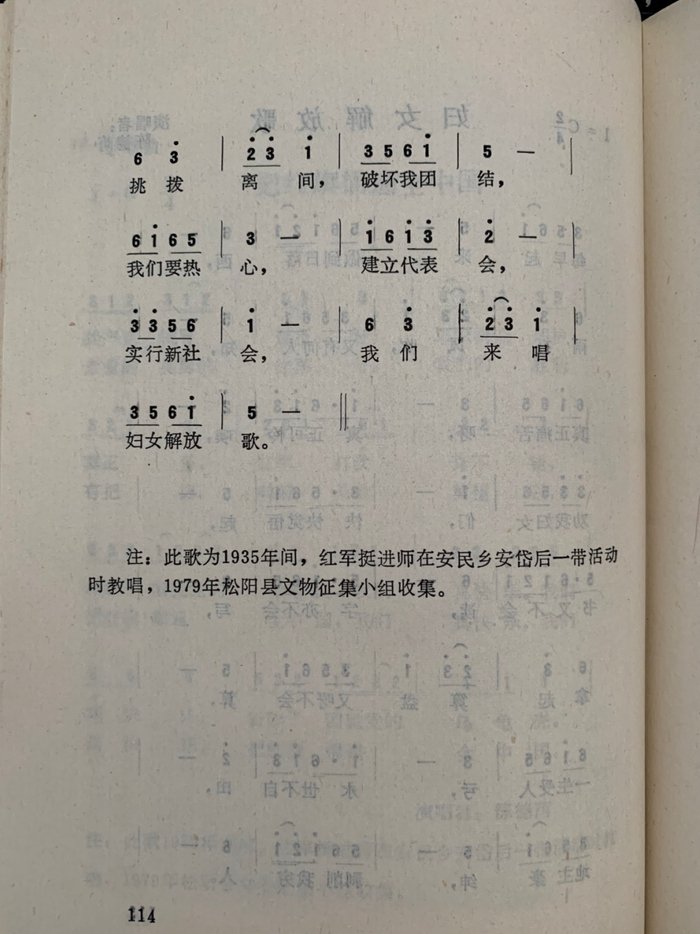 在丽水松阳县安民乡安岱后村等革命老区流传演唱的歌曲有很多,比如《妇女解放歌》《游击队歌》《红军最光荣》《十二月花名歌》《红军歌》《西山出剿》等等。以下三首就是红军挺进师在安岱后一带活动时教唱的歌曲。于1979年松阳县文物征集小组收集。
