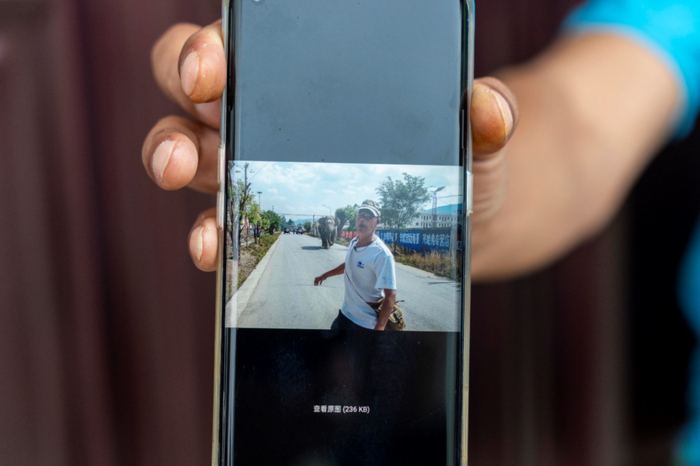 8月8日,普宗信在展示手机里自己曾经在街道上被亚洲象追的照片。陈欣波 摄