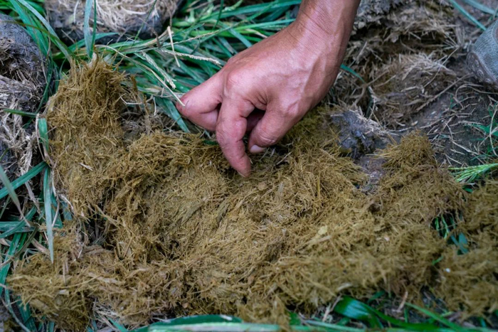 发现大象脚印后,他顺手找来一截树枝。“直径快30厘米了,就是‘老大’!”说完,老普继续往前走,看到了几坨大象粪便。他往上面踩了几脚,蹲下身,直接上手找线索。