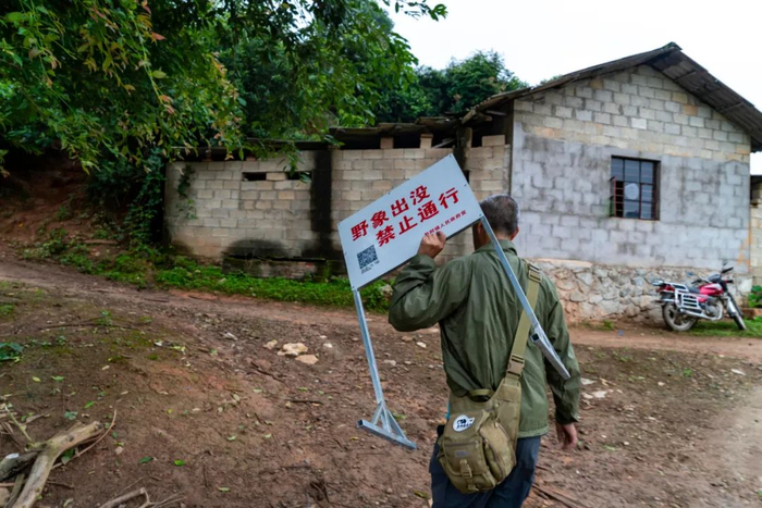 8月9日上午,在发现亚洲象活动地点之后,普宗信拿着警示牌去封路。陈欣波 摄