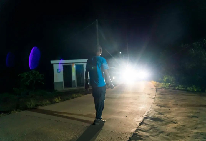 8月8日晚,普宗信在拦截一辆即将通过亚洲象活动区域的汽车并告知驾驶员大象活动情况。陈欣波 摄