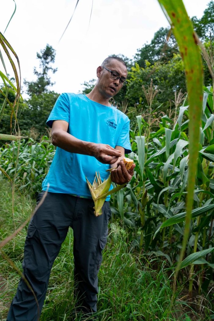 8月8日下午,普宗信在查看一根被亚洲象吃过的玉米。陈欣波 摄