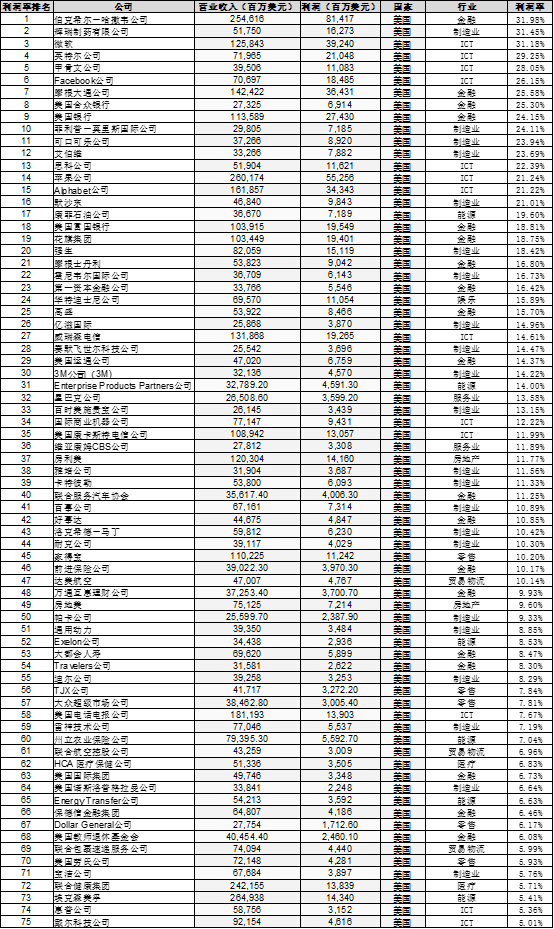 接下来我们看下美国入选企业里面,利润率超过了5%的企业,一起来震撼一把,看看美帝国主义最赚钱的公司有哪些,美国竟然有75家企业利润率超过了5%, 比我朝的31家不知道高到哪里去了。
