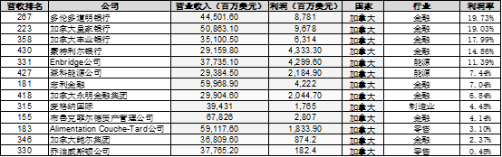 而俄罗斯,马来西亚,澳大利亚,巴西,加拿大五个国家都是靠能源矿产+金融两大支柱造就了高利润率,这个就不一一列举了,就放一个加拿大的五百强公司的排名,可以看出13家加拿大的五百强公司里面利润率排前八位的都是金融和能源公司,就只有一家制造业企业。