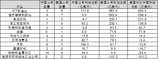 中美的相同点是,中国入选制造业公司来自ICT制造业的利润总额也是最高的,