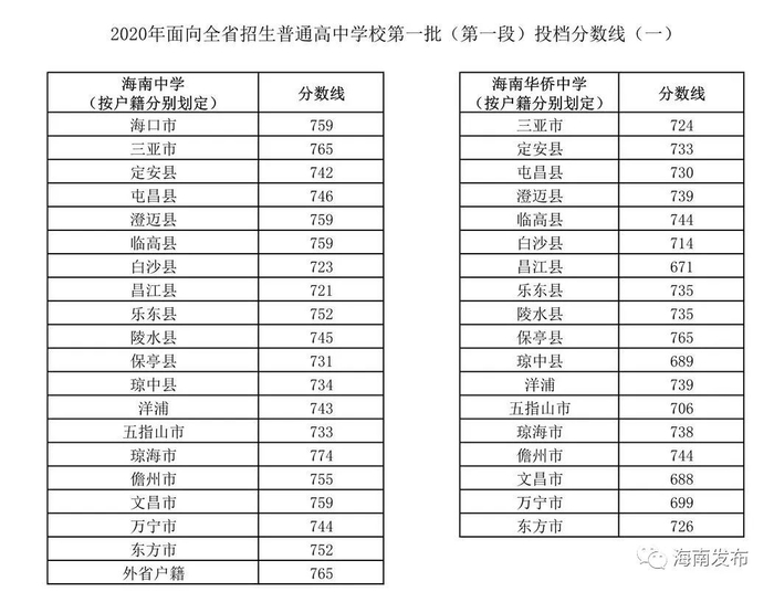 2020年海南省中招第一批(第一段)面向本市县投档分数线(四)显示,海口市:海南华侨中学本市户籍考生(含港澳台籍和三侨生)748分,本市学籍非本市户籍考生748分;海口市第一中学本市户籍考生(含港澳台籍和三侨生)729分,本市学籍非本市户籍考生736分;海口实验中学本市户籍考生(含港澳台籍和三侨生)675分,本市学籍非本市户籍考生691分;海口琼山中学本市户籍考生(含港澳台籍和三侨生)691分,本市学籍非本市户籍考生691分;海口市第四中学本市户籍考生(含港澳台籍和三侨生)682分,市学籍非本市户籍考生698分。