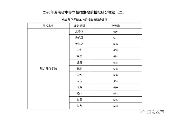 19日,海南省考试局发布2020年海南省中等学校招生提前批投档分数线(二),琼台师范学院定向免培生投档分数线出炉。