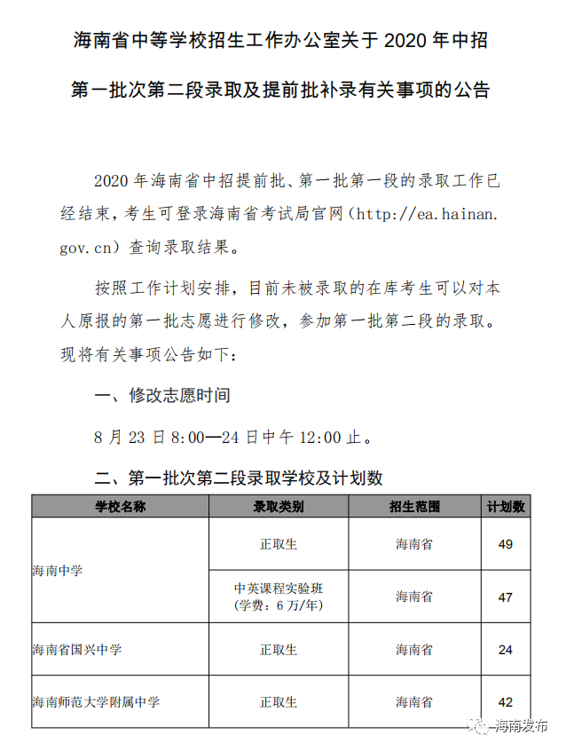 8月22日,海南省中招办发布关于2020年中招第一批次第二段录取及提前批补录有关事项的公告。第一批次第一段未被录取的考生可对原报的第一批志愿进行修改,参加第一批第二段的录取。志愿修改时间为8月23日8:00—8月24日中午12:00。