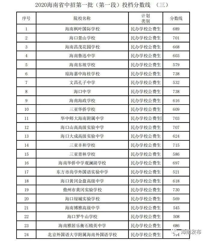 19日,海南省考试局发布2020年海南省中等学校招生提前批投档分数线(一),海南省19所学校提前批投档分数线出炉。