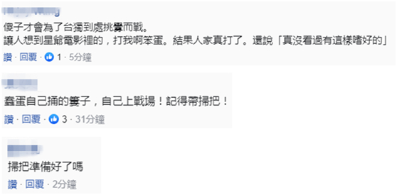 台军这段短片发布后,随即引起岛内网友的讨论,有人表示,“傻子才会为了‘台独’到处挑衅而战。”“蠢蛋自己捅的篓子,自己上战场!记得带扫把!”“扫把准备好了吗?”
