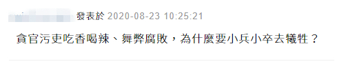 更友网友批评民进党当局,“贪官污吏吃香喝辣、舞弊腐败,为什么要小兵小卒去牺牲?”