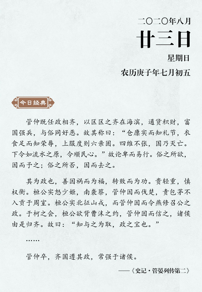 管仲做了齐相执政后,因为小小的齐国地处海滨,就流通货物,积蓄财富,使得国家富足,兵力强大,并与老百姓好恶相一致。所以他在《管子》中说:“粮食充足了,百姓才能顾到礼节;吃饱穿暖了,百姓自会去分辨荣辱。在上位的人行礼度,六亲就紧紧依附,礼义廉耻若不大力提倡,国家就会灭亡。颁布的政令如同有源的流水,要能顺从民众的心愿。”因此管仲的政令简单,易于施行。百姓想要的,就给他们兴办;百姓反对的,就替他们废除。