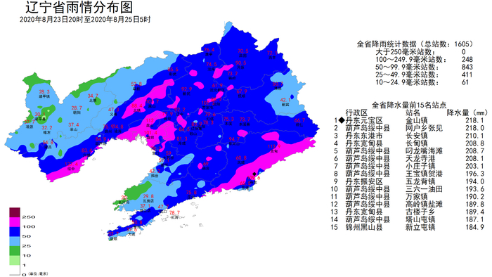 2020年8月23日20时至25日5时,本轮降雨过程基本结束,辽宁省1605个气象站,出现降雨的共有1573个,平均降雨量为69.9毫米。沈阳、大连、鞍山、本溪、丹东、锦州、营口、阜新、辽阳、铁岭、盘锦、葫芦岛地区248个气象站出现100~250毫米的降雨,沈阳、大连、鞍山、抚顺、本溪、丹东、锦州、营口、阜新、辽阳、铁岭、朝阳、盘锦、葫芦岛、沈抚示范区地区843个气象站出现50~100毫米的降雨,沈阳、大连、鞍山、抚顺、本溪、丹东、锦州、营口、阜新、辽阳、铁岭、朝阳、葫芦岛地区411个气象站出现25~50毫米的降雨,沈阳、大连、鞍山、丹东、锦州、阜新、辽阳、朝阳、葫芦岛地区61个气象站出现10~25毫米的降雨,最大降雨量出现在丹东元宝区金山镇,为218.1毫米,最大小时降雨量出现在沈阳新民市东蛇山子镇,为64.4毫米。 2020年8月23日20时至25日5时,全省各市平均降雨量为:沈阳86.9毫米,大连46.1毫米,鞍山81.7毫米,抚顺56.4毫米,本溪73.8毫米,丹东105.9毫米,锦州84.9毫米,营口57.6毫米,阜新52.5毫米,辽阳74.0毫米,铁岭77.7毫米,朝阳31.1毫米,盘锦108.0毫米,葫芦岛79.2毫米,沈抚示范区72.1毫米。