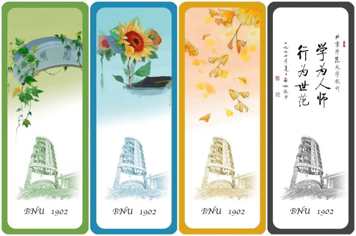 【北京校区】北京校区元素的四季书签,春日曦园绿意盎然,夏季葵花生机勃勃,秋天银杏随风飘飞,冬日是厚重的校训。从今往后,师大的一草一木将陪伴你度过未来四年,而寒暑假里,书签也会代替它们陪着你。