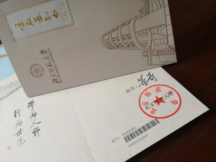 沿袭师大传统,花纹隐约显现,含蓄内敛,古朴温厚。镀金浮雕的“录取通知书”五字端庄大方,打开来能看到启功体的校训,校训碑上同款。檐角飞扬,铜铃轻响,愿北师大人能将“学为人师,行为世范”谨记在心,远扬于外。