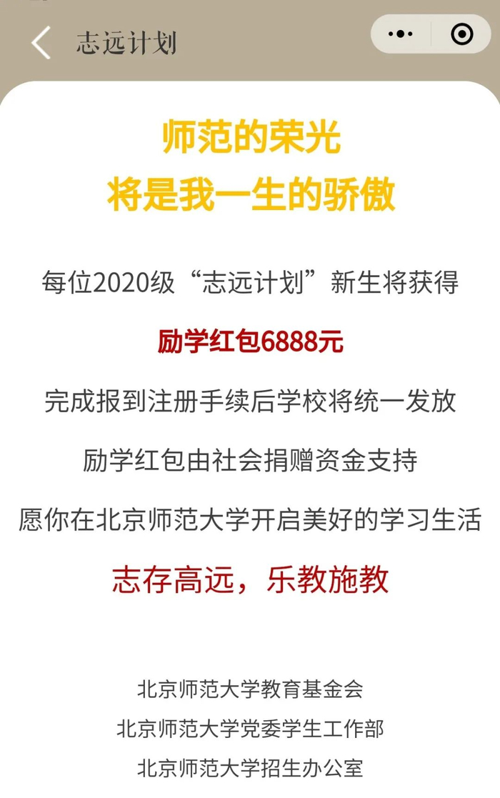 重点来了,北师大2020年首次招收的“志远计划”的小伙伴们,还将收到一份诚意满满的惊喜大红包!!!