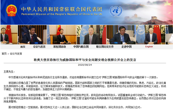 在当天举行的视频公开会上,安理会成员国围绕新冠疫情背景下的恐怖主义威胁和国际反恐合作阐述立场、进行讨论。
