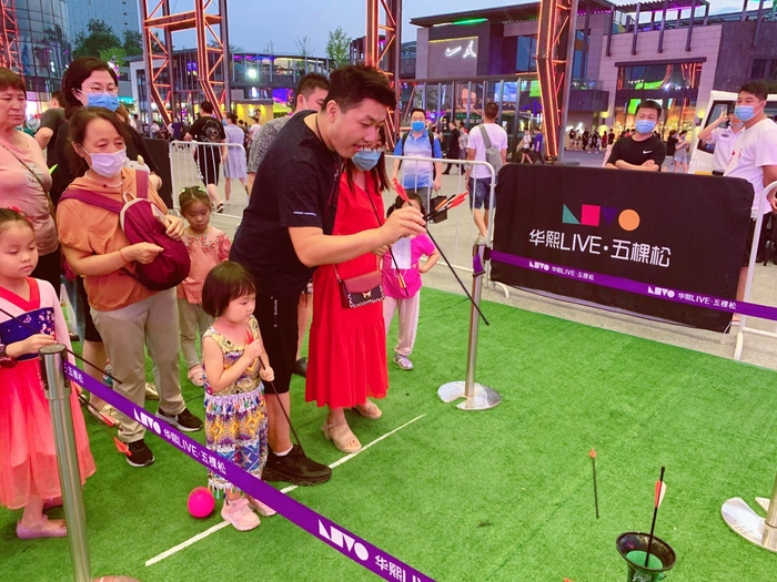 “Mission For U”活动地点在华熙LIVE·五棵松中央广场,现场设置了“一箭穿心”和“心有灵犀”等游戏装置,融合了传统投壶和科技互动,还布置了七夕专属网红互动打卡墙,吸引了众多消费者围观并参与。新京报记者在现场发现,这个活动不仅吸引了众多情侣,还有大量亲子家庭也乐在其中。