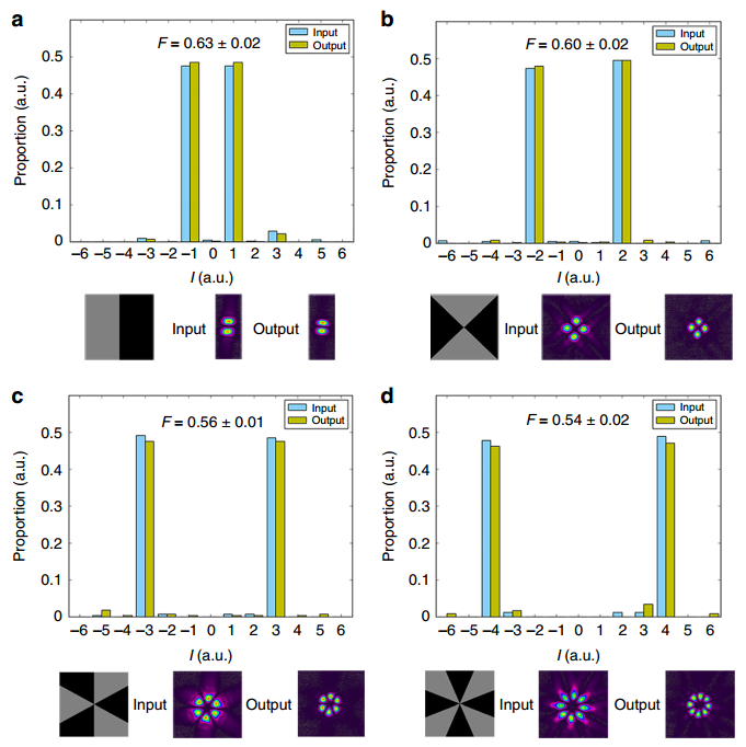 为了在实验上演示这一全光体系所具有的量子隐形传态并行处理能力,该团队在输入端用光学轨道角动量同时编码了两个模式独立且正交的待传态,利用上述构建的全光量子隐形传态体系,在输出端实现了这两个待传态突破经典极限的高保真复现,展示了该体系在信息容量提升方面的独特优势。