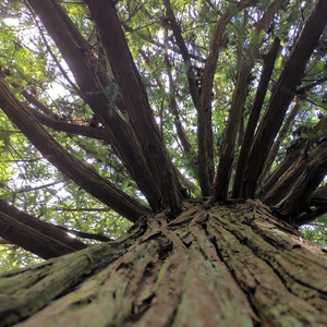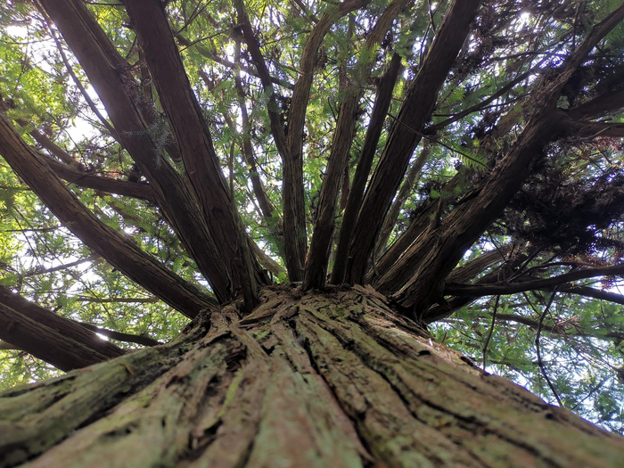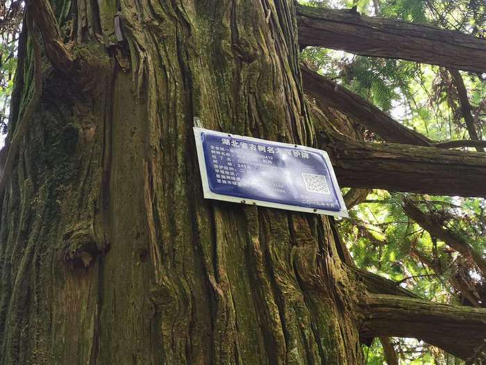 古树是一棵杉树,树根处有大量白蚁啃食之后留下的粉末,邓世选告诉记者,每年都有人来这里治理,但毕竟地处深山,难以根绝。从地面往上,树干笔直,一直到五六米处,忽然伸出来许多和地面平行的树枝,这些树枝大多有碗口粗细,在树干上密密麻麻地长成一圈,然后又沿着树干往上,仿佛台阶一般长上去,遮住了头顶的天空,偶尔才有一两缕阳光,透过缝隙照射下来。