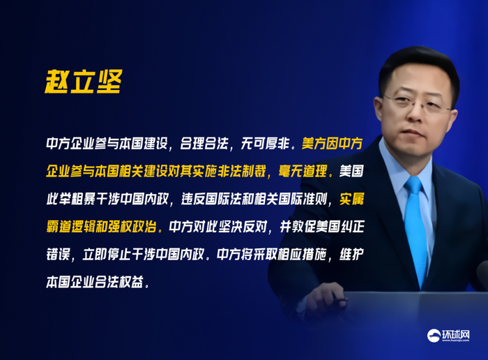 赵立坚在当天举行的外交部例行记者会上表示,中国在本国领土上开展相关建设,完全是主权范围内的事情,与军事化无关。中方企业参与本国建设,合理合法,无可厚非。美方因中方企业参与本国相关建设对其实施非法制裁,毫无道理。美国此举粗暴干涉中国内政,违反国际法和相关国际准则,实属霸道逻辑和强权政治。中方对此坚决反对,并敦促美国纠正错误,立即停止干涉中国内政。中方将采取相应措施,维护本国企业合法权益。