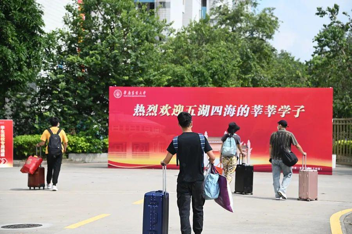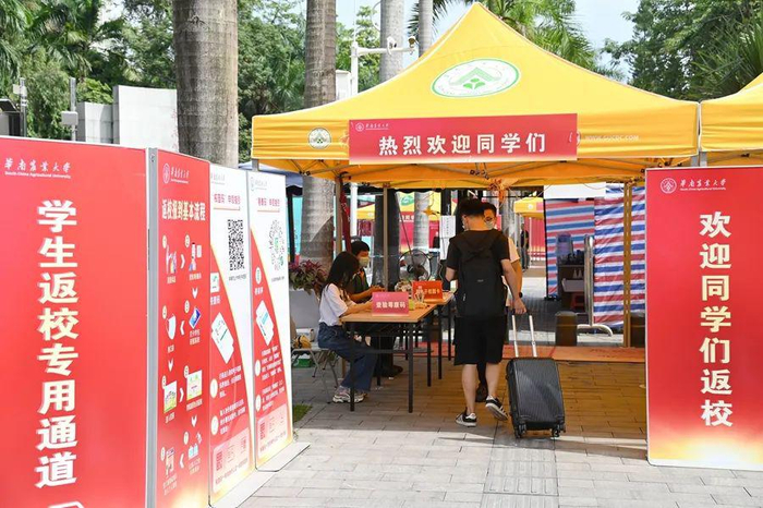 8月27日上午,昨夜刚下过雨的广州天气晴好,华南农业大学各校门外,陆续迎来了2020年秋季学期第一批返校学生。据悉,为全力防控疫情确保开学安全,落实学生分期、分批、错峰返校的要求,从8月27日至9月25日,学校分8期学生返校,包括全体本科生、未返校研究生老生和2020级研究生新生共4万余人。