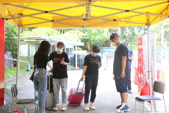 根据要求,学生返校报到按照基本流程“八步法”,即测量体温、查验粤康码、打卡学生识别系统、换口罩、进入校园、学院报到点报到、公寓入口处行李消杀、凭《报到证明》进入个人宿舍。返校期间,学校开放西南门、牌坊门、汇景北门、思创园正门、西门5个学生返校入口。每天上午8点到晚上9点,由学工部(研工部)老师带领学生干部执勤轮岗,迎接学生归来。在西南门,学校安排了返校交通专列出发至各学生宿舍,为学生返校后提供便利。