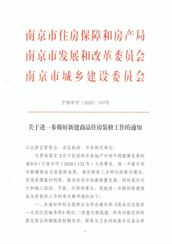 根据江苏省南京市住房保障和房产局8月27日的消息,8月14日起,南京市已实施由南京市住房保障和房产局、南京市发展和改革委员会和南京市城乡建设委员会联合出台的《关于进一步做好新建商品住房装修工作的通知》。